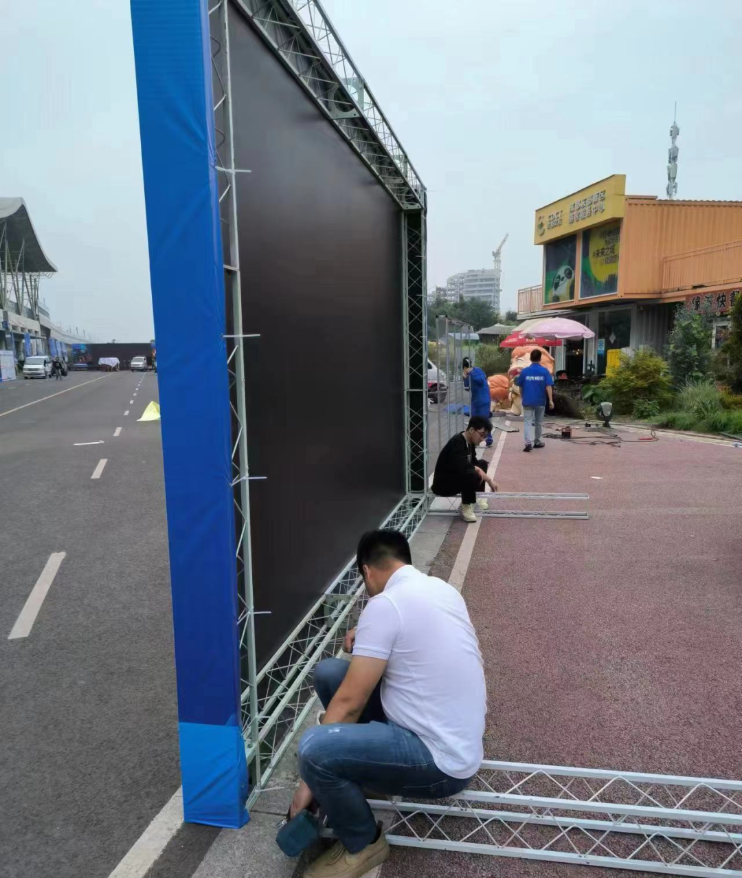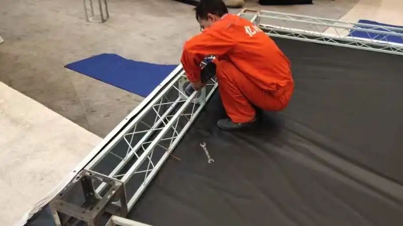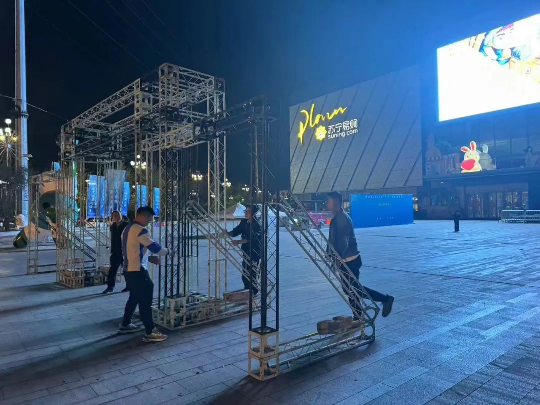 四川億和的安(ān)裝(zhuāng)人員正在對啓動儀式活動門頭進行桁架安(ān)裝(zhuāng)。