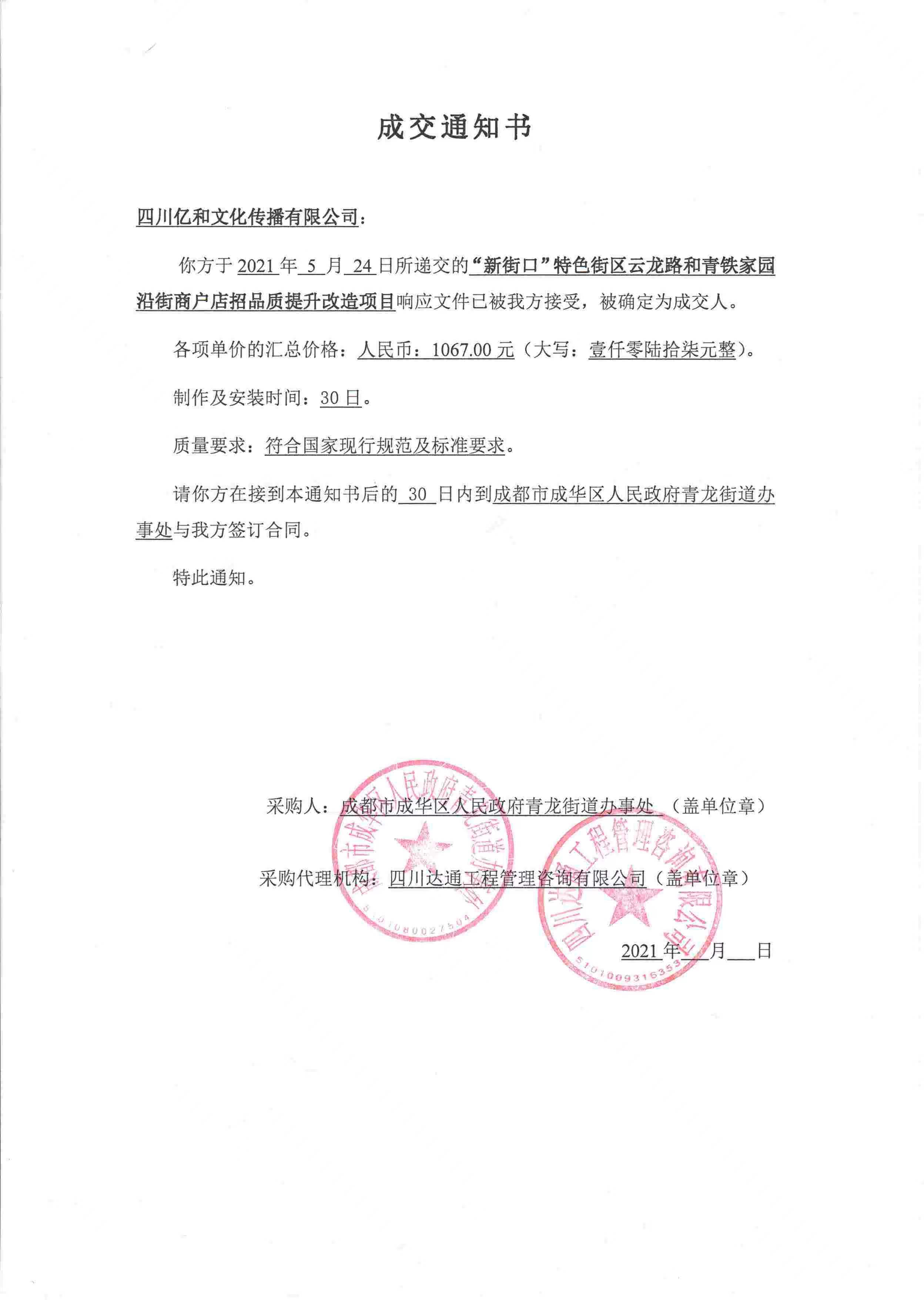 【喜訊】公(gōng)司中(zhōng)标2021年“成都市成華區(qū)人民(mín)政府青龍街(jiē)道'新(xīn)街(jiē)口’特色街(jiē)區(qū)雲龍路和青鐵家園沿街(jiē)商(shāng)戶店(diàn)招品質(zhì)提升改造項目”!