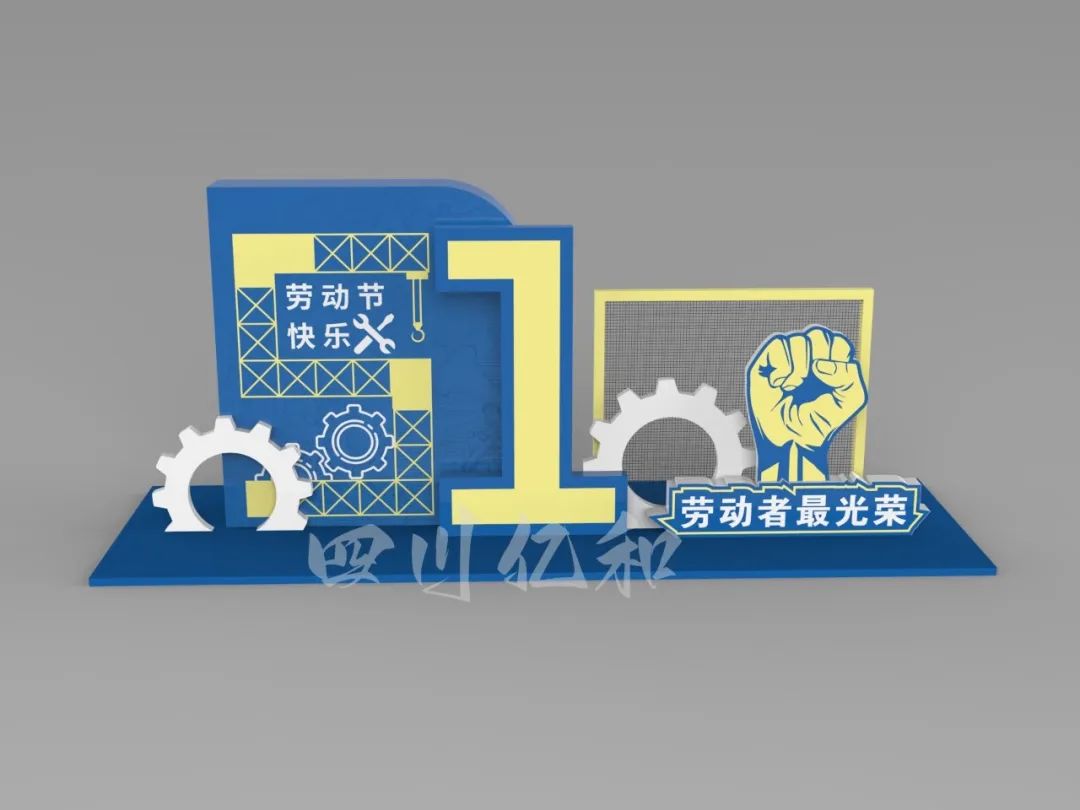 以藍色為(wèi)主色調,搭配齒輪、扳手、建築工(gōng)地等工(gōng)業元素,象征勞動者的辛勤與智慧。巨大的“1”字造型,寓意勞動者的團結與力量,傳遞“勞動者最光榮”的精(jīng)神。