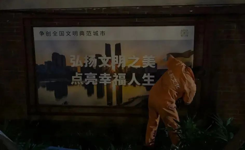 工(gōng)作(zuò)人員安(ān)裝(zhuāng)争創全國(guó)文(wén)明典範城市宣傳欄