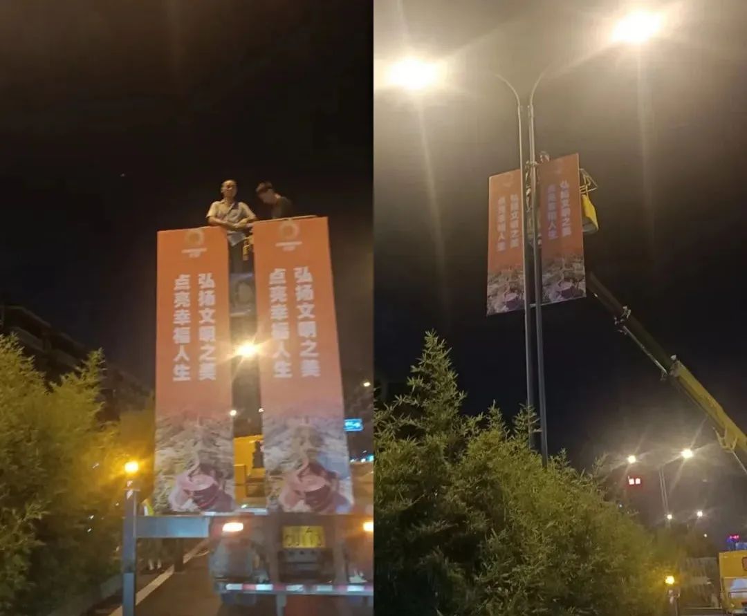 夜間高空安(ān)裝(zhuāng)精(jīng)神文(wén)明建設燈杆道旗