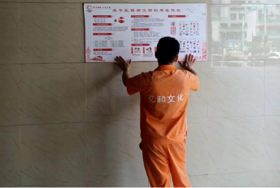億和文(wén)化工(gōng)作(zuò)人員安(ān)裝(zhuāng)精(jīng)神文(wén)明建設宣傳牌