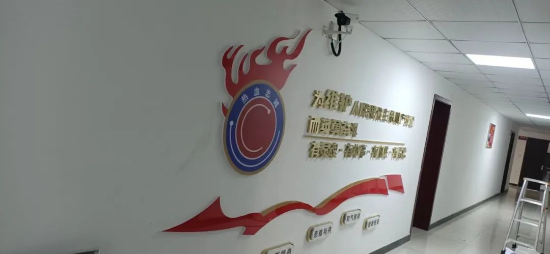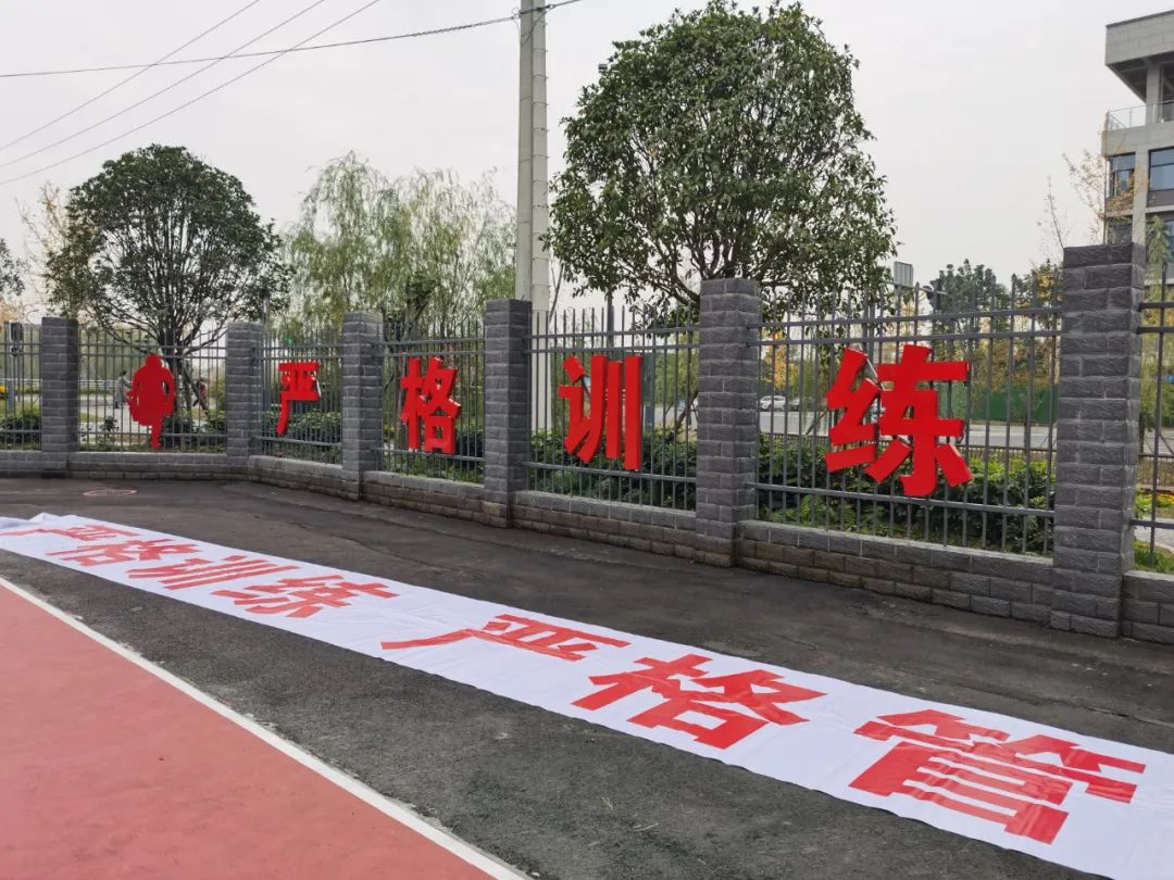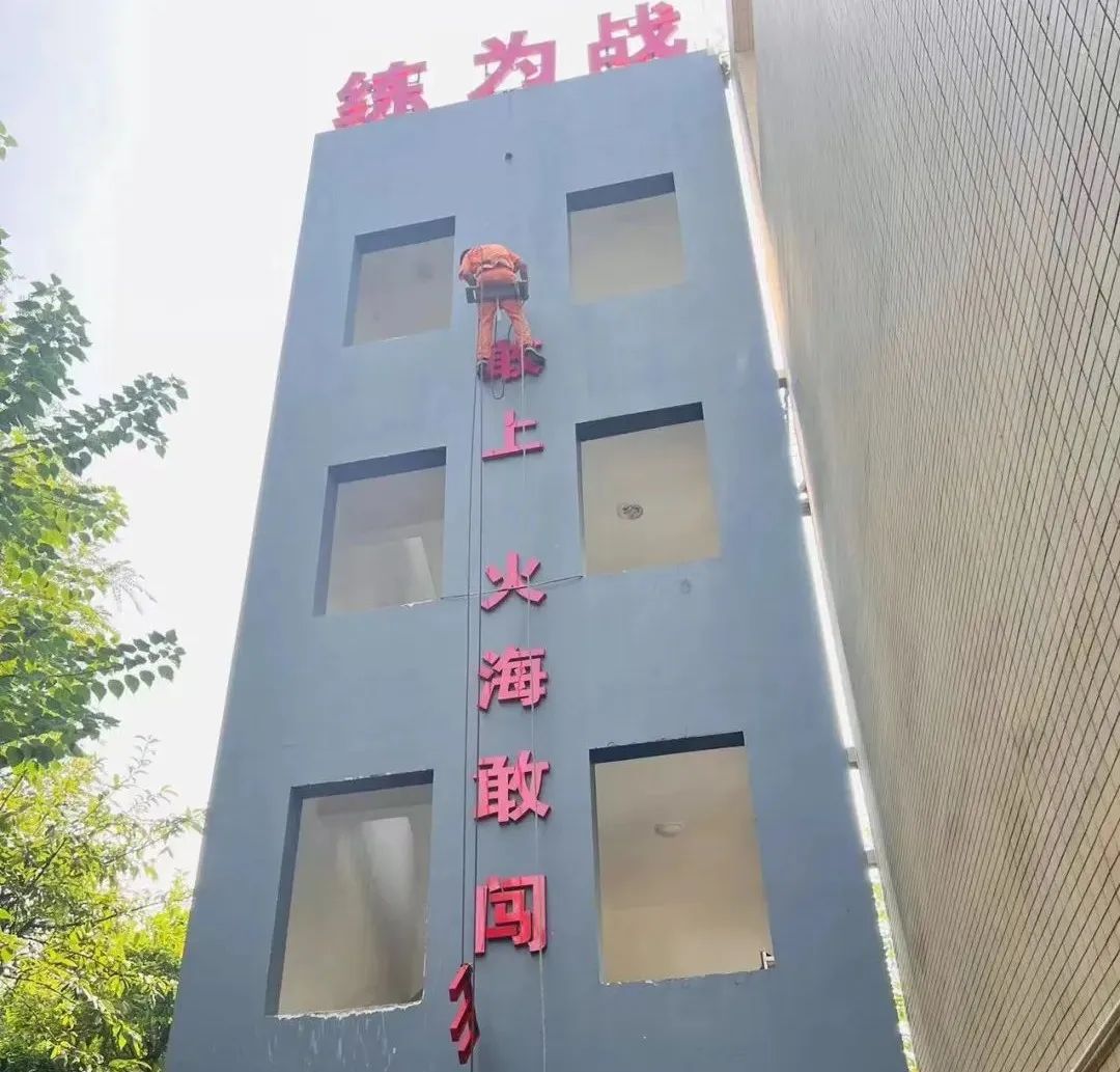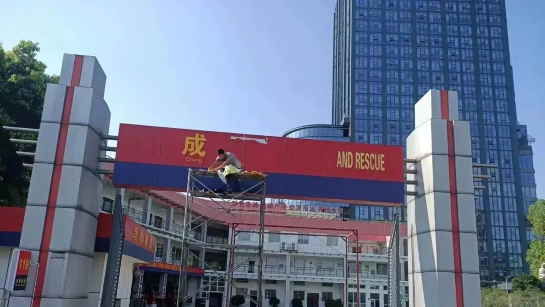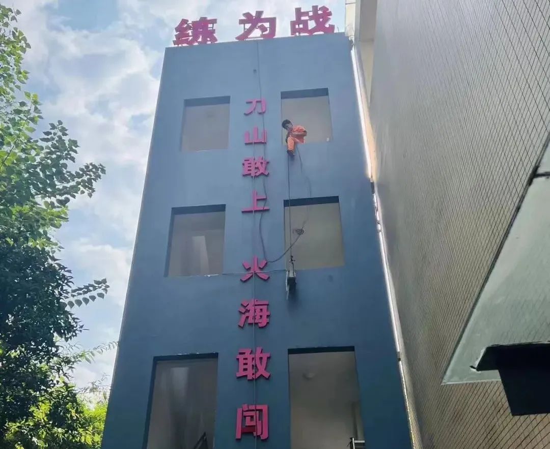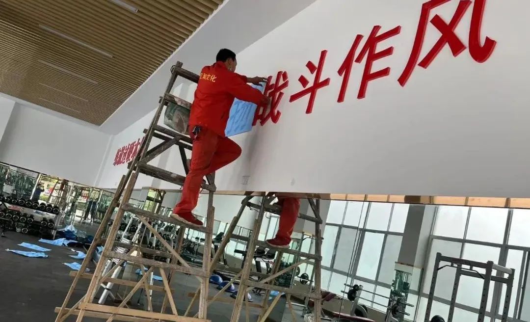 | 工(gōng)作(zuò)人員安(ān)裝(zhuāng)訓練塔、訓練場标語 |