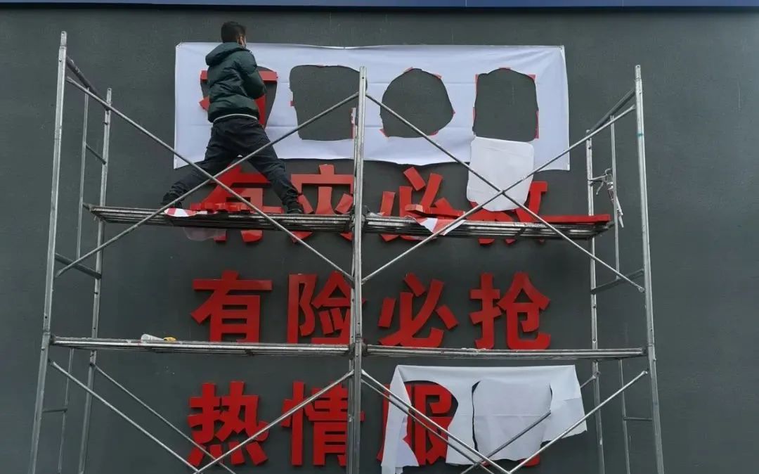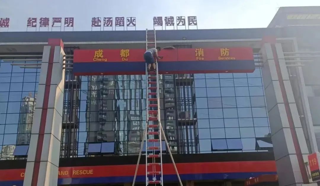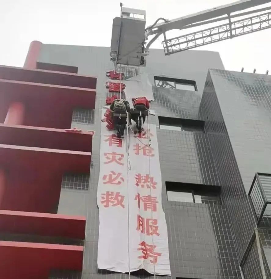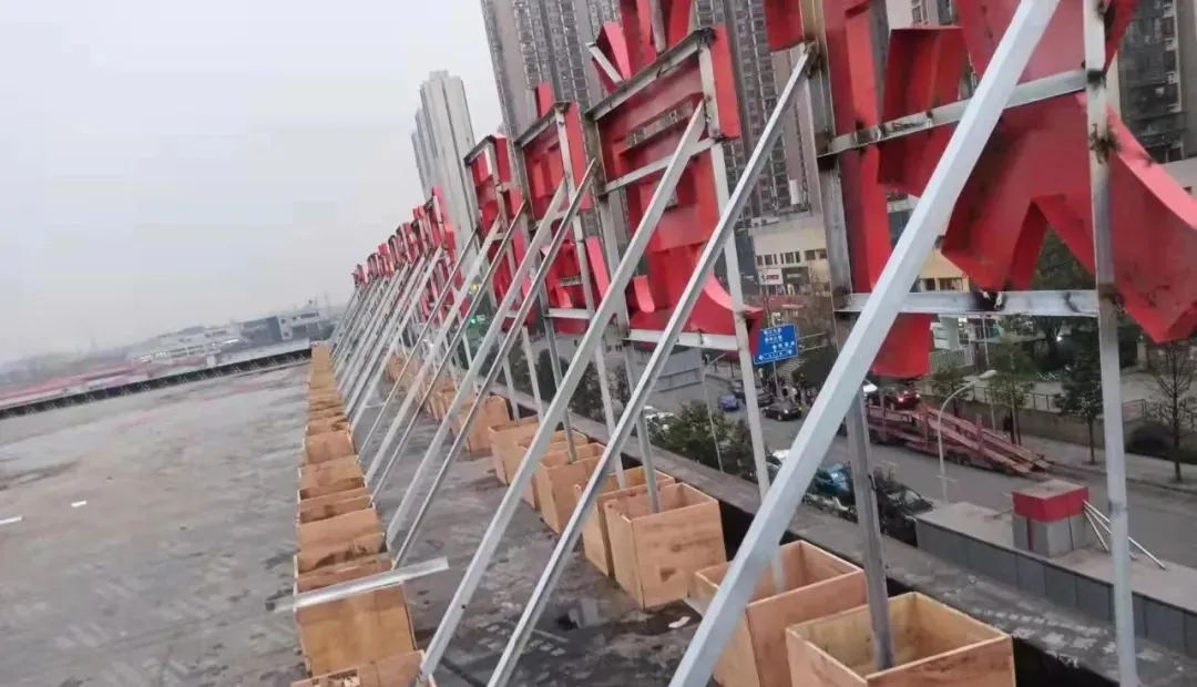 | 工(gōng)作(zuò)人員安(ān)裝(zhuāng)主樓标語 |