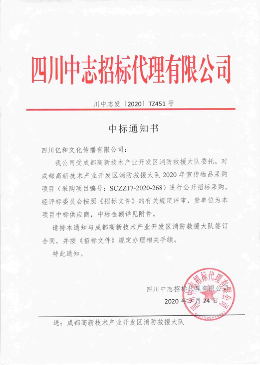 • 【喜訊】公(gōng)司中(zhōng)标2020年“成都高新(xīn)技(jì )術産(chǎn)業開發區(qū)消防救援大隊2020年宣傳物(wù)品采購(gòu)項目”!
