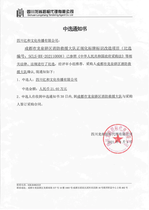 • 【喜訊】公(gōng)司中(zhōng)标2021年“成都市龍泉驿區(qū)消防救援大隊正規化标牌标識改造項目”!